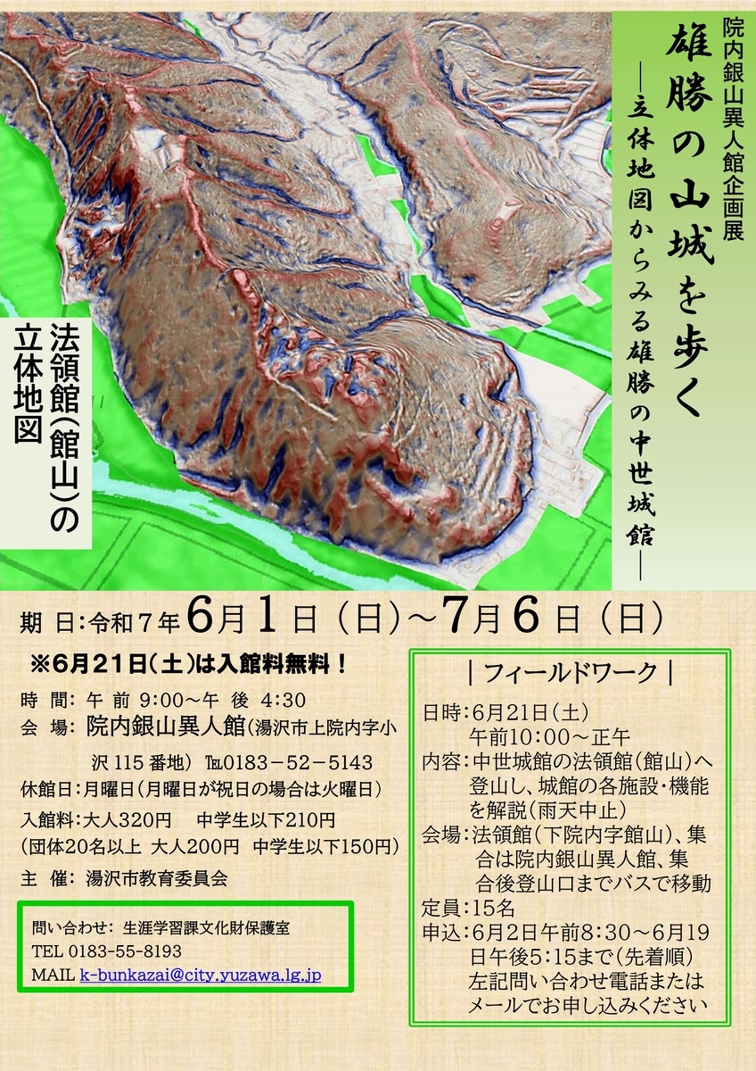 6月1日(日)から7月6日(日)までの間、院内銀山異人館(秋田県湯沢市)において令和7年度企画展「雄勝の山城を歩く―立体地図からみる雄勝の中世城館―」が開催されます。