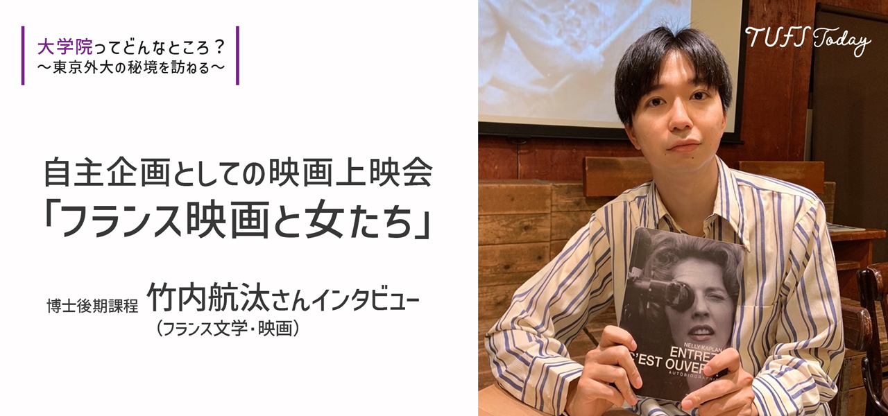 フランス文学・映画を研究しながら、ご自身で映画上映会の企画・運営もされている博士後期課程 2 年の竹内航汰(たけうち・こうた)さん。今年は 8 月末から 9 月頭にかけて「フランス映画と女たち」というタイトルで、日本未公開作品を中心とした映画上映会が行われます。「映画上映会は、自分の研究成果の発信の場なのかもしれません」と語る竹内さん。ご自身の研究テーマと、映画上映会についてお話を伺いました。