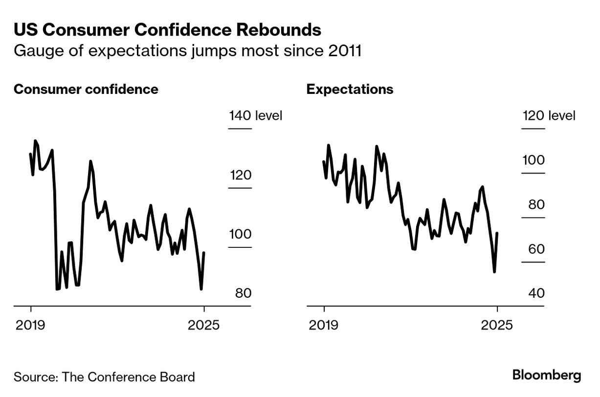 米消費者信頼感指数は5月に急回復し、4年ぶりの大幅上昇となった。前月は5年ぶりの水準に落ち込んでいた。関税の一時停止を背景に、景気や労働市場の見通しが改善した。
