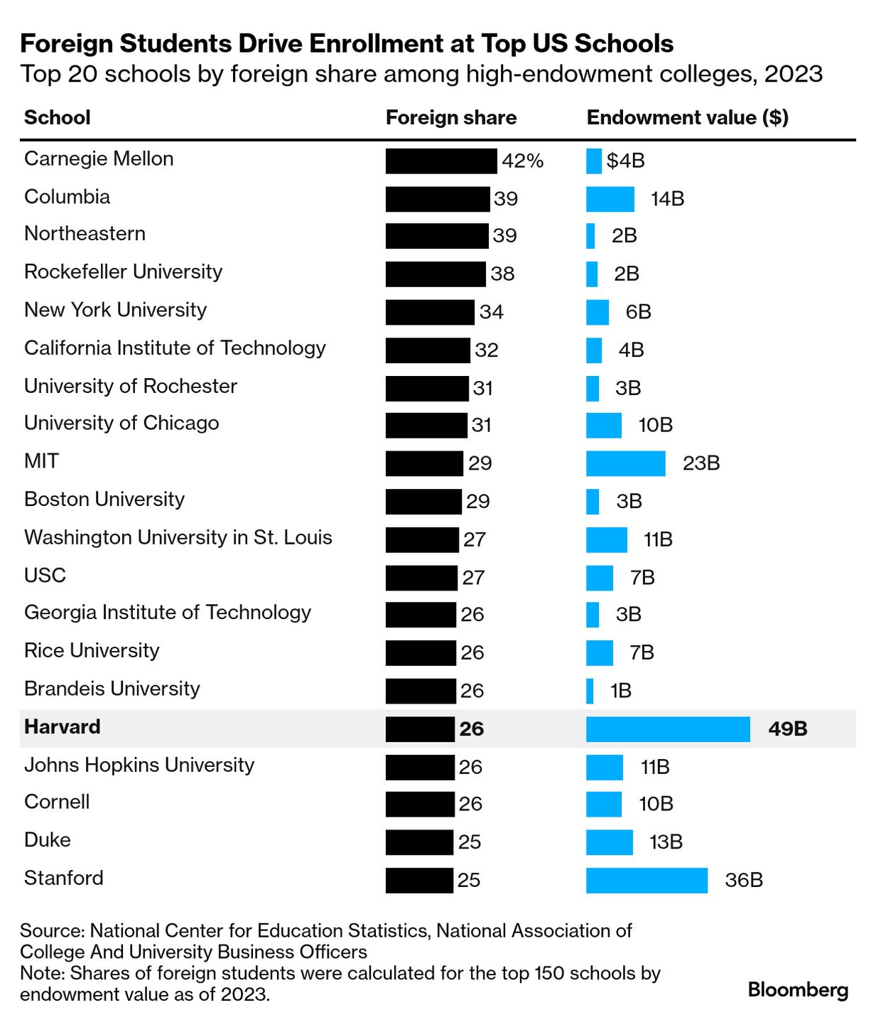 2022-23年度の連邦政府データをブルームバーグが分析したところ、最も豊富な寄付基金を持つ150大学の外国人留学生比率は15%と全米の大学全体に比べて高かった。コロンビア大は学部・大学院の約40%、ハーバード大やコーネル大、デューク大、スタンフォード大は25%前後を占めた。