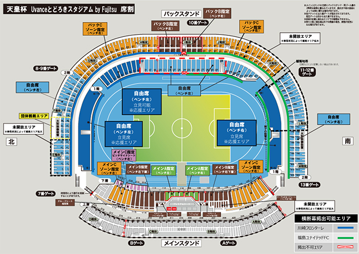 その他詳細は、「特定非営利活動法人川崎市サッカー協会オフィシャルウェブサイト内「天皇杯2回戦 川崎フロンターレvs福島ユナイテッドFCの応援エリアおよび横断幕の掲出箇所について」をご確認ください。