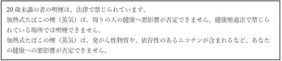 BATグループでは、たばこ製品のマーケティングを適切に実施するために国際的な自主規準を設定しています。そのため消費者に対するたばこ製品に関するすべてのコミュニケーションには、20歳未満の方へのコミュニケーションをお控えいただくとともに、「喫煙と健康に関する注意文言」を表示することを関係各位にお願いしております。加熱式たばこに関しては、記事掲載していただく際には、「健康に関する注意文言」が表示されるようご配慮いただきたく存じます。ご協力の程、何卒よろしくお願い申し上げます。