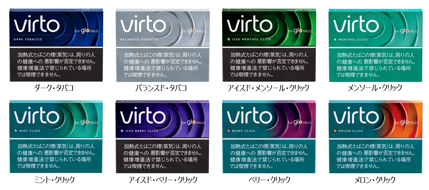 glo™ Hilo専用の新スティックvirto™も発売いたします。virto™のたばこ葉はブレンダーが丁寧に調合し、スティック全体に無駄なく熱が伝わるよう独自に設計された構造により、吸い心地の良さを実現しています。virto™は、レギュラー、メンソール、フレーバーメンソールに分類される全8種類の味わいが用意されており、たばこ葉がデバイスに落ちないStickSeal™テクノロジーも搭載されています。