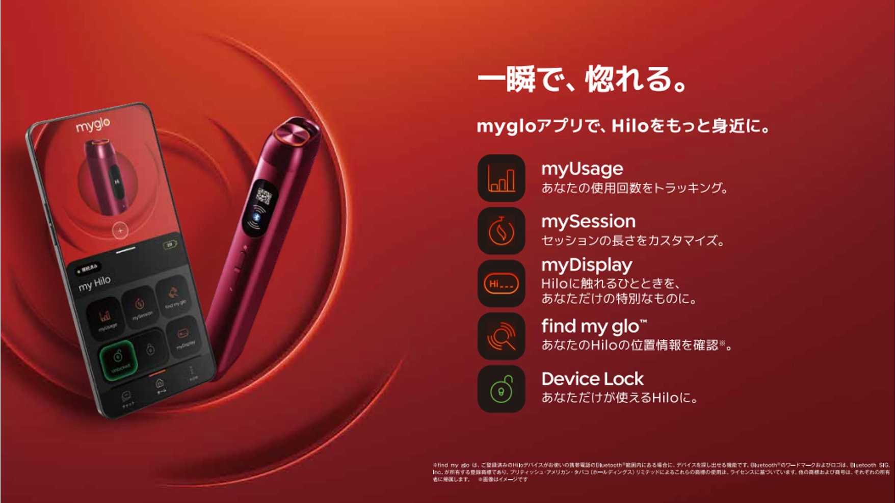 [1] find my gloは、ご登録済のHiloデバイスがお使いの携帯電話のBluetooth®の範囲内にある場合に、デバイスを探し出せる機能です。Bluetooth®のワードマーク及びロゴは、Bluetooth SIG, Inc.が所有する商標登録であり、ブリティッシュ・アメリカン・タバコ(ホールディングス)リミテッドによるこれらの商標の使用は、ライセンスに基づいています。他の商標及び商号は、それぞれの所有者に帰属します。