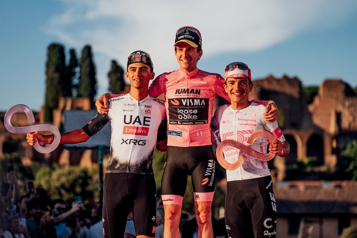 ジロ・デ・イタリア2025総合表彰台:2位イサーク・デルトロ(メキシコ、UAEチームエミレーツXRG) 、1位サイモン・イェーツ(イギリス、ヴィスマ・リースアバイク)、3位リチャル・カラパス(エクアドル、EFエデュケーション・イージーポスト) photo:RCS Sport