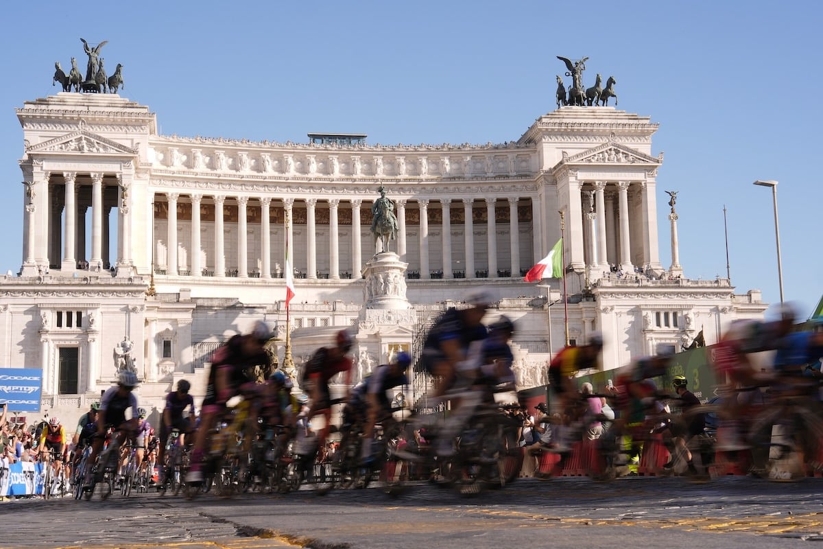 ヴィットーリオ・エマヌエーレ2世記念堂の前を通過する159名の選手たち photo:RCS Sport