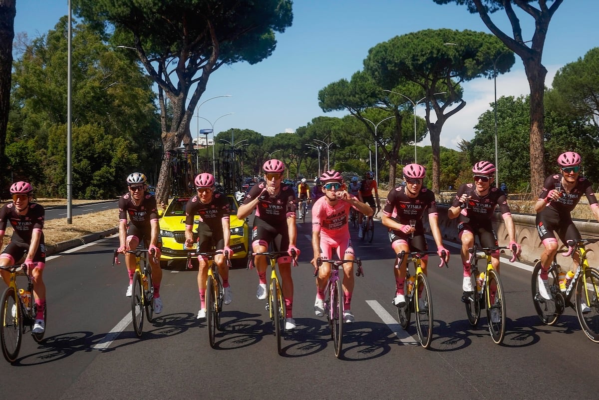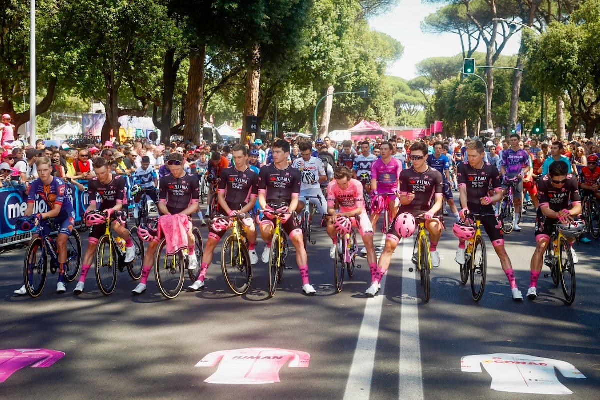 スタート地点の集団先頭に並んだのは、前日に行われたフィネストレ峠の山岳決戦で総合首位に立ったサイモン・イェーツ(イギリス)を擁するヴィスマ・リースアバイク。マリアローザを着用するイェーツはバイクやヘルメットまでピンク色に染め上げ、チームメイトたちは黒ベースにピンクの差し色の入ったジャージ姿で登場した。そしてスタート前に、昨年末に引退したロベルト・ヘーシンク(オランダ)の妻であり、亡くなったデイジー氏への黙祷が捧げられた。