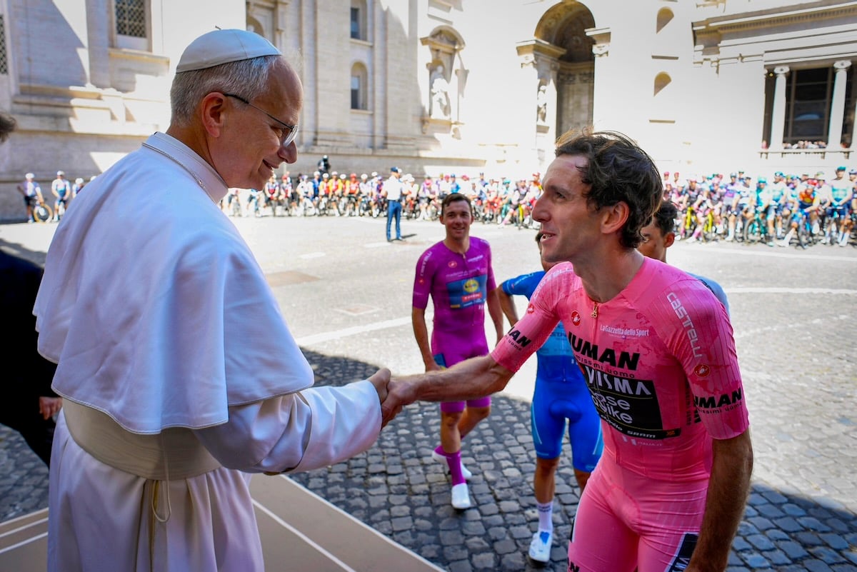 そして走り出した159名の選手たちがヴィットーリオ・エマヌエーレ2世記念堂の前を通過し、バチカン市国に入国して一度脚を止める。マリアローザのイェーツら4賞ジャージを纏った選手たちが、5月8日に就任したばかりであるローマ教皇レオ14世に挨拶。その後レオ14世に見送られながら選手たちはローマへと戻り、そしてまずは3週間に渡る戦いを労いあった。