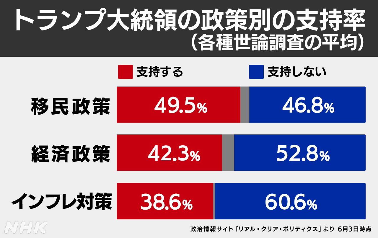 国民の評価は分かれている。トランプ大統領の移民政策全般について尋ねた各種世論調査の平均値は「支持する」が49.5%、「支持しない」が46.8%。