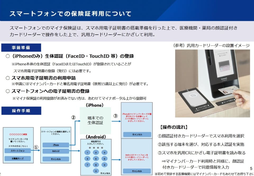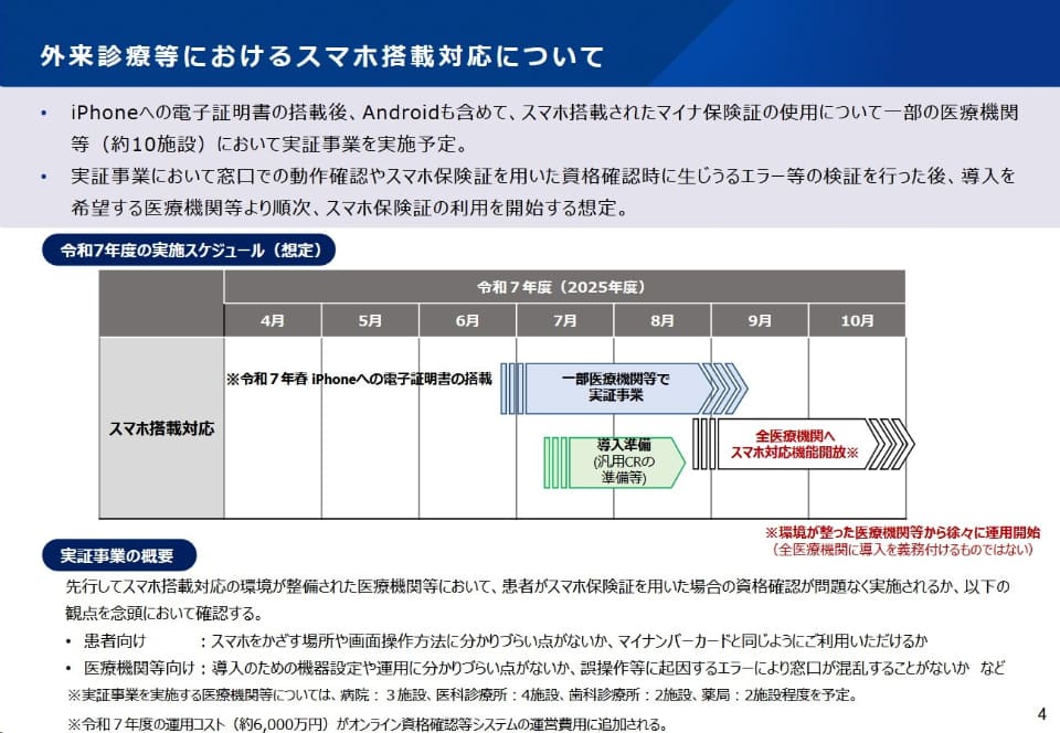 マイナ保険証への対応は、マイナンバー機能を搭載したiPhoneおよびAndroidスマホの双方で実現する。スケジュールは、2025年7月から一部医療機関で実証実験を行った後、9月頃より環境の整った医療機関より正式な運用を開始する予定。