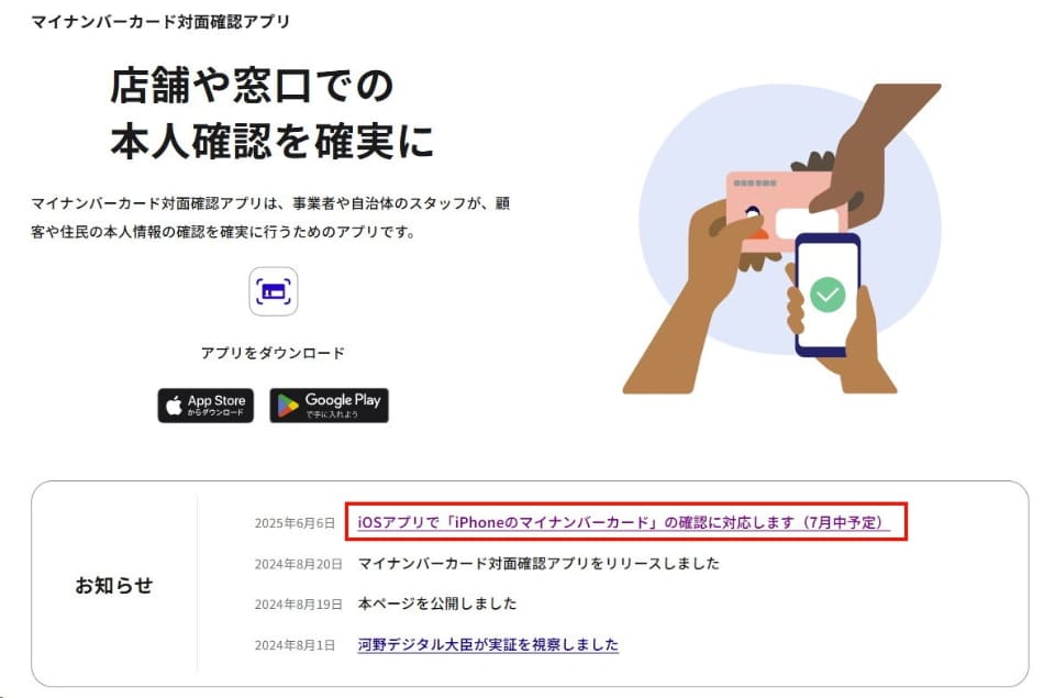具体的には、iPhoneのマイナンバーカードに格納されているマイナンバーカードの券面記載情報を、デジタル庁が提供しているスマホ用アプリ「マイナンバーカード対面確認アプリ」のiOS版で読み取って本人確認が可能になる。こちらは2025年7月中の対応を予定している。