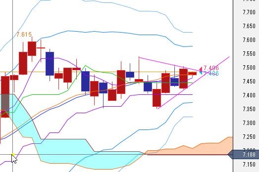 週足、7.5近辺で揉みあう。ボリバン中位は越えている。5月5日週-26日週の上昇ラインがサポート。5月12日週-26日週の下降ラインが上値抵抗。5週線が20週線を上抜く。