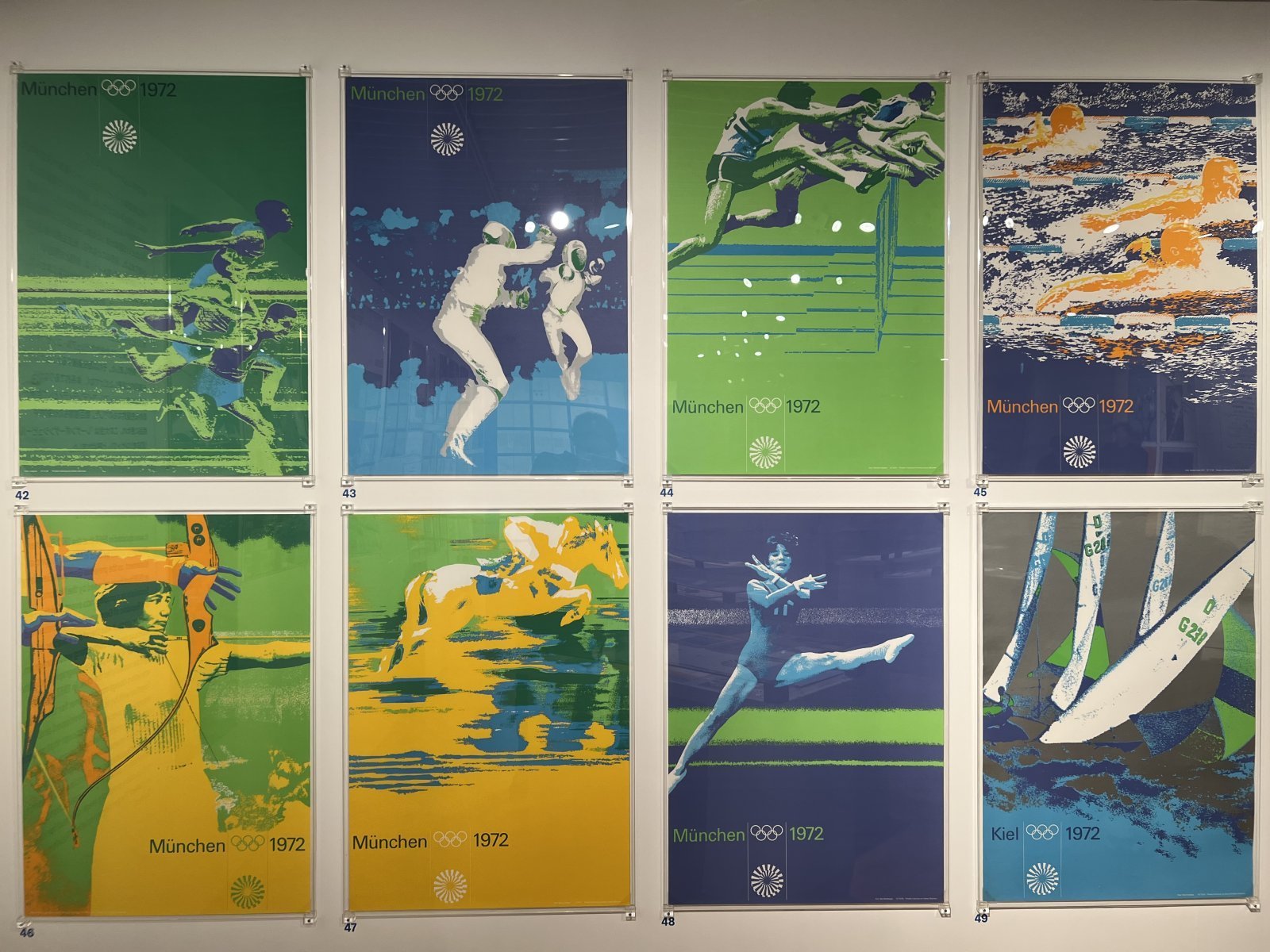 『アイデンティティシステム』地階展示室風景。左後方の壁にはオトル・アイヒャーによる1972年ミュンヘンオリンピックの競技ポスターが展示されている。手前の展示ケースにも同オリンピックの閉会式プログラムなどの資料が並んでいる。Photo:Mitsumasa Fujitsuka