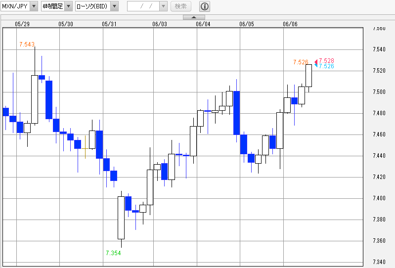 週初2日は、前週末にトランプ米大統領が鉄鋼・アルミ関税を50%に引き上げると表明したことを受けて7.3円台へと下落して取引が始まりました。しかし、米ホワイトハウスが週内に米中首脳会談を行う可能性が高いと発表したことで7.4円台を回復。3日も、植田日銀総裁が「無理に利上げすることはない」と発言したことなどからペソ高・円安の動きが継続しました。4日には一時7.5円台へと上昇したのち失速しましたが、5日に米中首脳電話会談が行われ、速やかに貿易交渉を開始することが決まると再び上昇。6日の東京市場では7.526円前後へと続伸して5月29日以来の高値を付ける場面もありました。