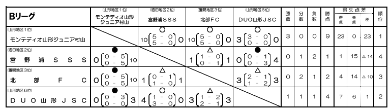 1位:モンテディオ山形ジュニア村山、2位:DUO山形JSC、3位:北部FC、4位:宮野浦SSS