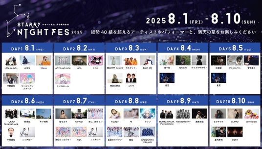 2025年8月1日(金)~8月10日(日)に開催される天空の楽園ナイトツアースペシャルイベント「STARRY NIGHT FES 2025」の出演アーティスト、パフォーマーの出演日が決定いたしました。