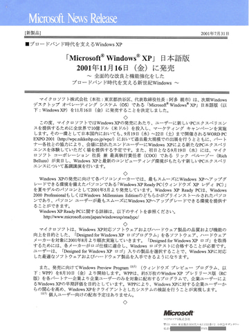 2001年7月31日、マイクロソフト(現日本マイクロソフト)は、Windows XPを発表した。発売日は同年11月16日。「ブロードバンド時代を支える新世紀OS」と位置づけた。