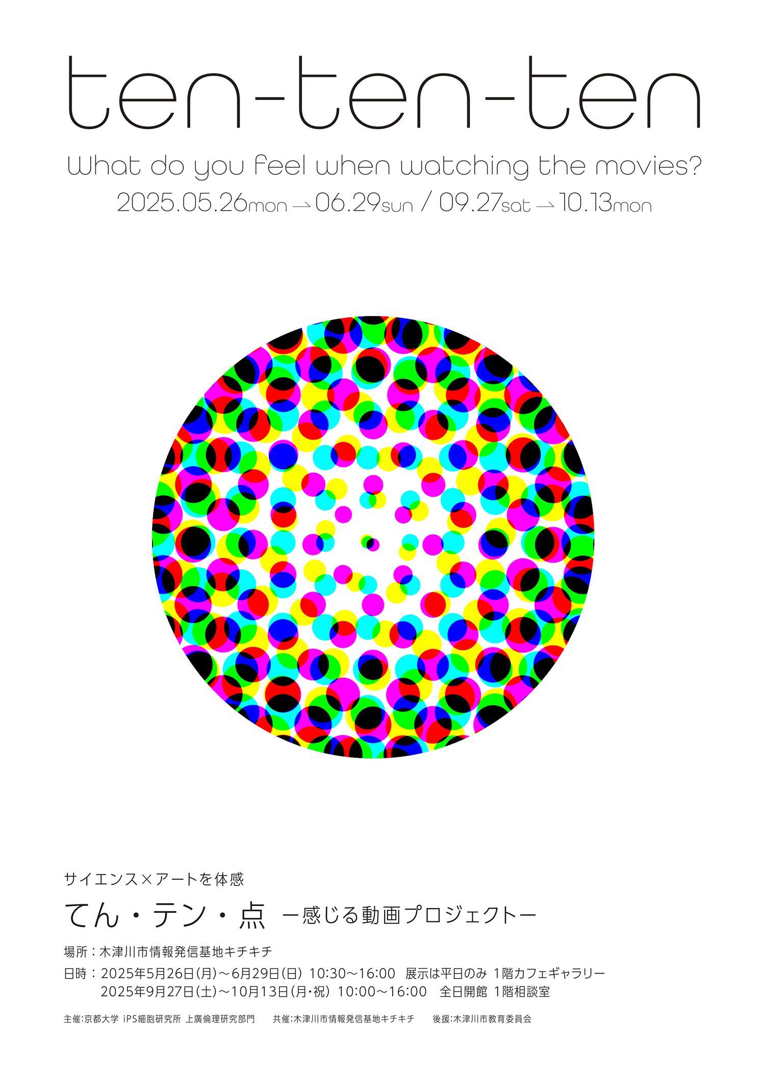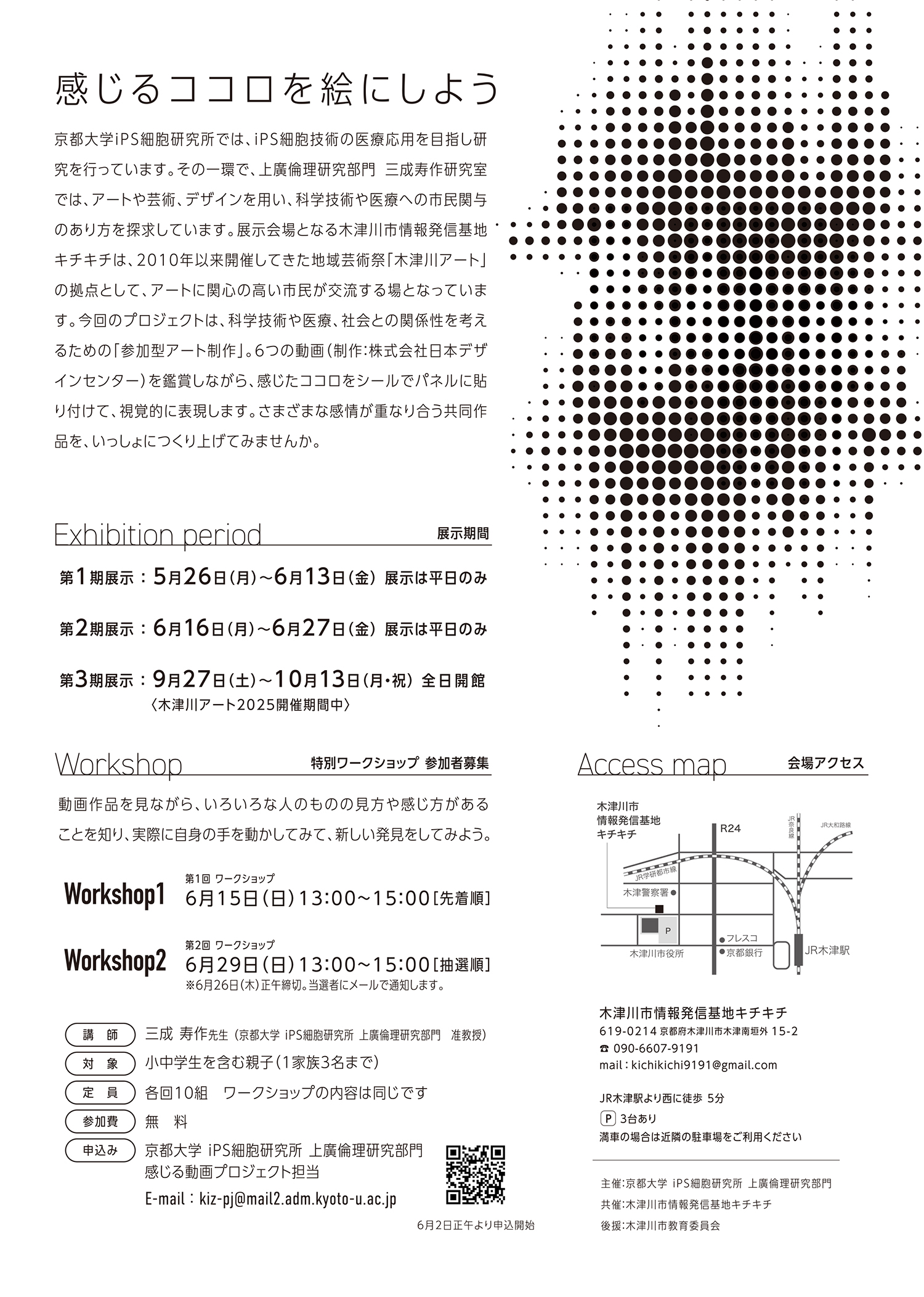 iPS細胞研究所(CiRA)では、iPS細胞技術の医療応用を目指し研究を行っています。上廣倫理研究部門 三成寿作研究室では、アートや芸術、デザインを用い、科学技術や医療への市民関与のあり方を探求しています。展示会場となる木津川市情報発信基地キチキチは、2010年以来開催してきた地域芸術祭「木津川アート」の拠点として、アートに関心の高い市民が交流する場となっています。今回のプロジェクトは、科学技術や医療、社会との関係性を考えるための「参加型アート制作」。6つの動画(制作:株式会社日本デザインセンター)を鑑賞しながら、いろいろな人のものの見方や感じ方があることを知り、実際に自身の手を動かしてみて、新しい発見をしてみませんか。
