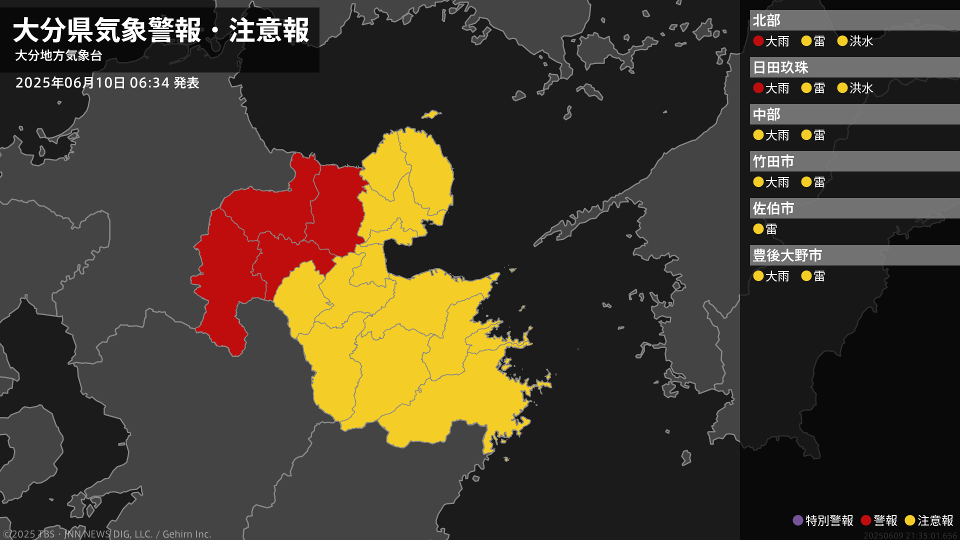 気象台は、午前6時34分に、大雨警報(土砂災害)を中津市、日田市、宇佐市、玖珠町に発表しました。