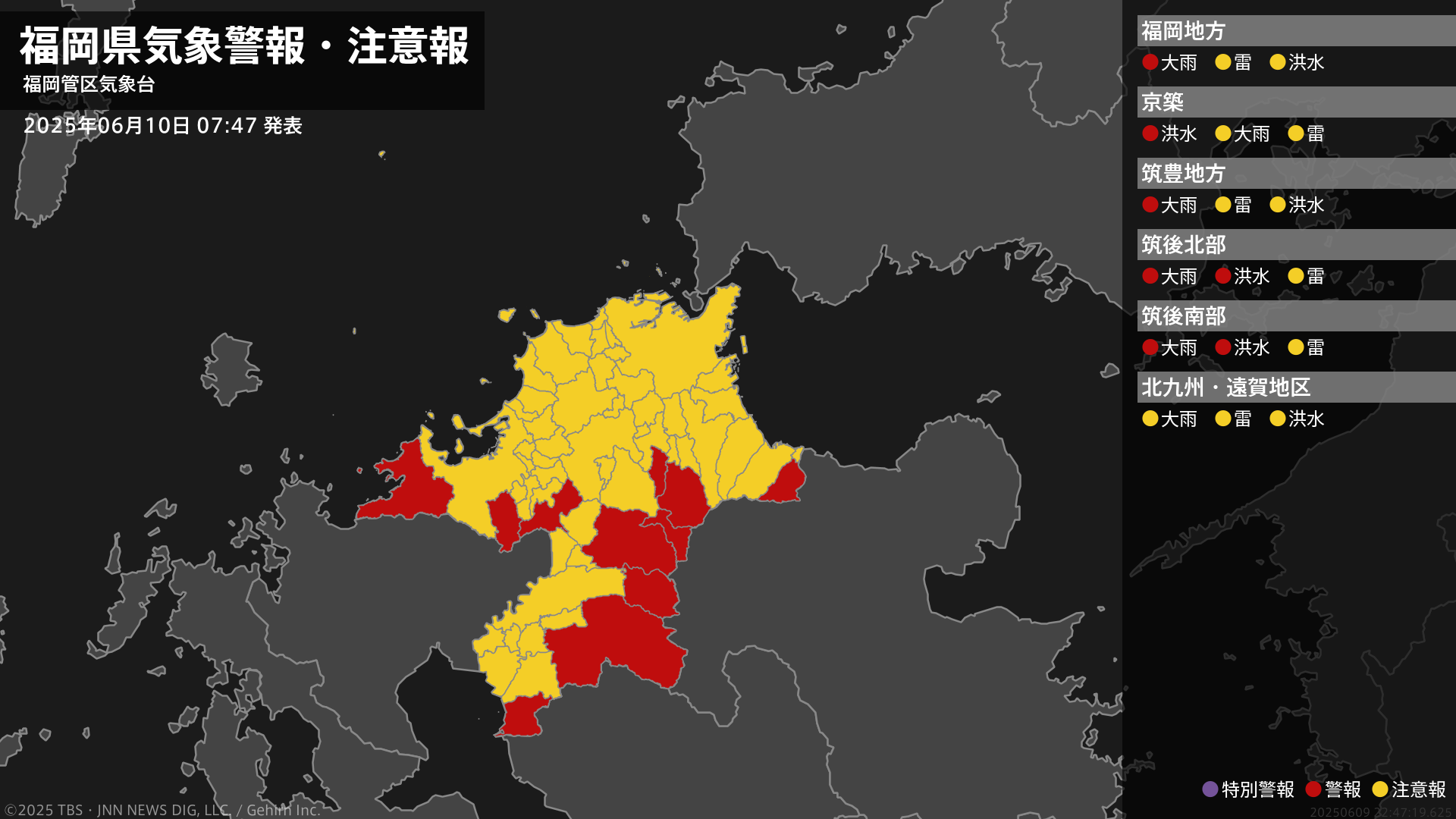 気象台は、午前7時47分に、洪水警報を八女市、うきは市、上毛町に発表しました。