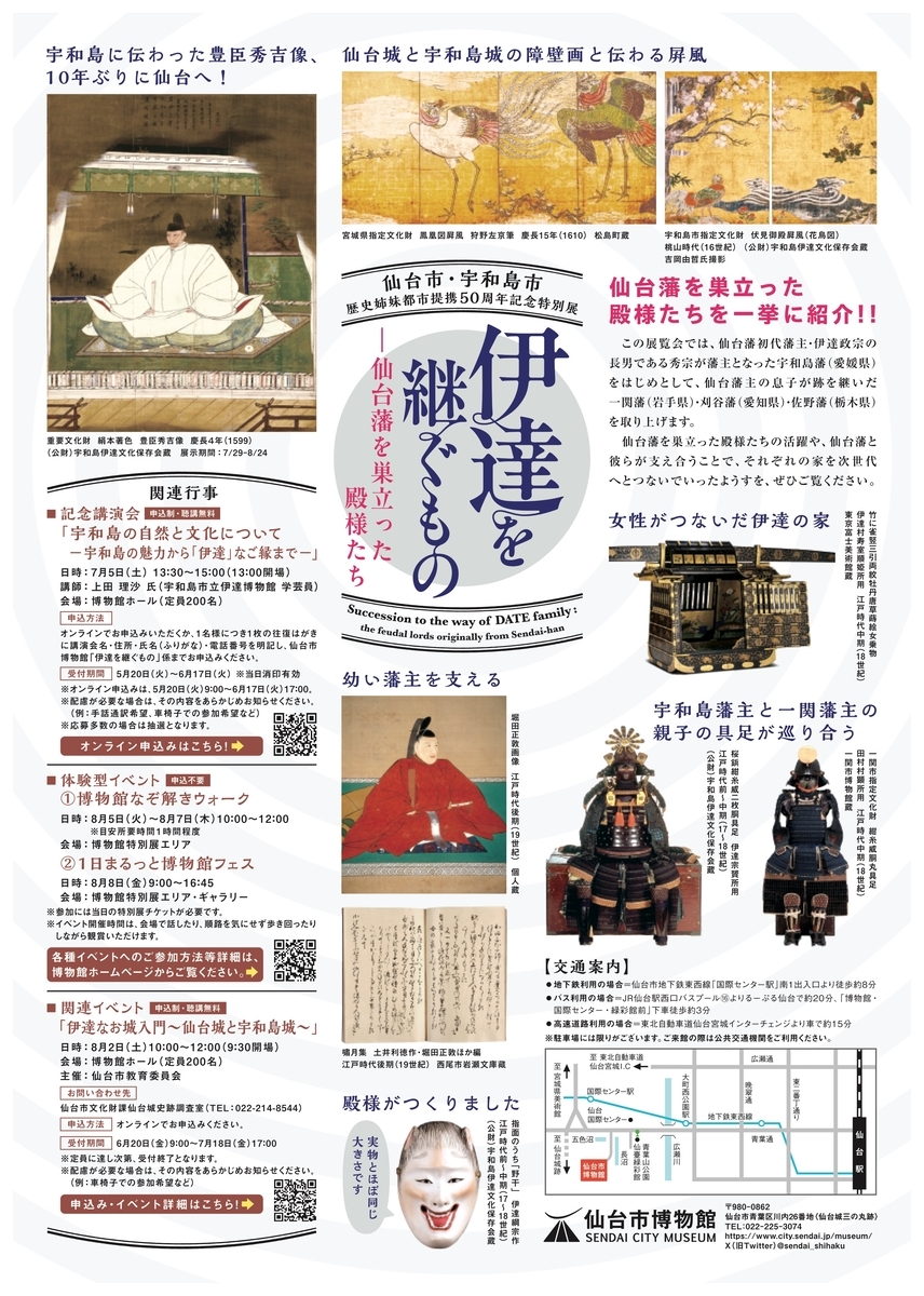 7月4日(金)から8月24日(日)までの間、仙台市博物館(宮城県仙台市)において仙台市・宇和島市歴史姉妹都市提携50周年記念特別展「伊達を継ぐものー仙台藩を巣立った殿様たち」が開催されます。一般1200円。