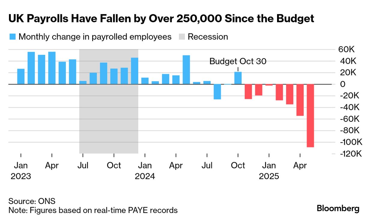 4月に施行された260億ポンド(約5兆1000億円)給与税引き上げにより、企業のコストが上昇。労働市場悪化の原因となっているとみられる。