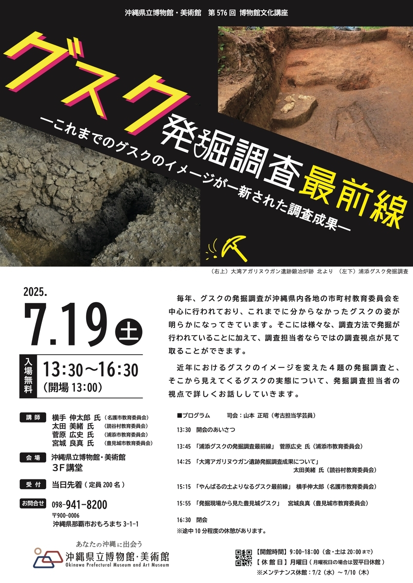 7月19日(土)、沖縄県立博物館・美術館(沖縄県那覇市)において第576回博物館文化講座「グスク発掘調査最前線」が開催されます。