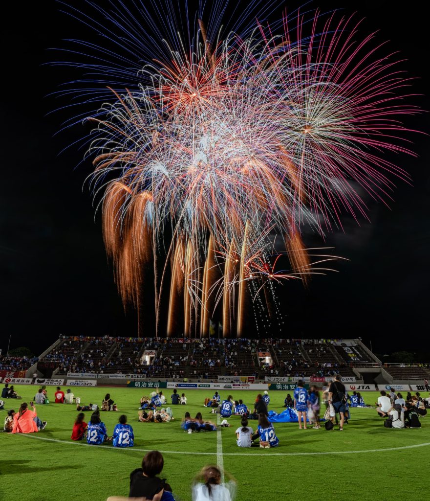 今年の花火企画についても、全国花火競技大会で花火業界最高峰の栄誉とされる「内閣総理大臣賞」を受賞した株式会社マルゴー(山梨県)のプロデュースで開催いたします。ピッチの芝生の上で思い思いにくつろぎながら約20分間の花火ショーを満喫ください!