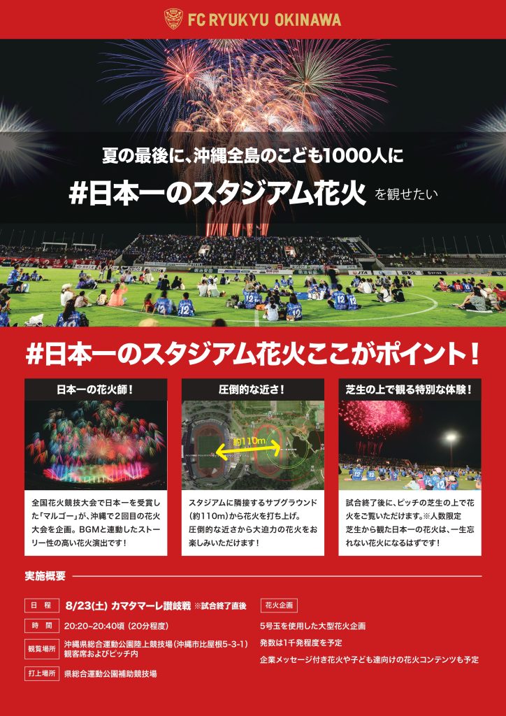 中には経済格差や体験格差など、日々の生活で我慢を強いられてしまう子どもたちも存在しており、FC琉球ではひとり親家庭や離島在住など様々な環境にある沖縄の子どもたちに、サッカーの試合とともに花火を観に来てもらおうと本イベントを企画しております。