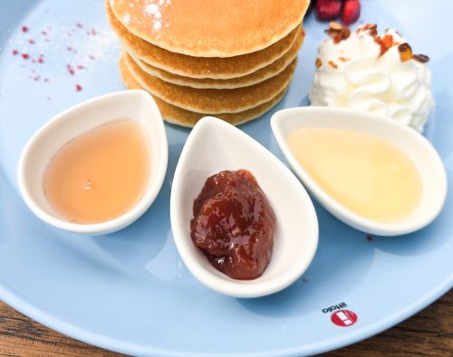 お好みでメープルシロップ、オーストリアのイチゴジャム、ハチミツをつけて食べます。