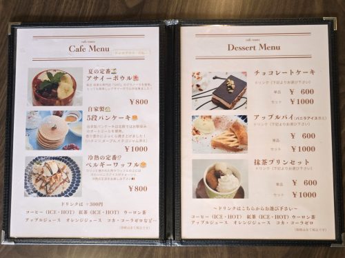 アサイーボウル、ベルギーワッフルなどのカフェメニューや、デザートメニューもあります。