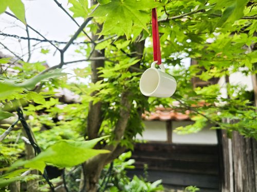 玄関先の青もみじの木の枝に飾られた、小さなマグのオーナーメントが風に揺れていました。