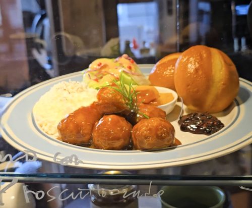 内容は、大山ジビエ (イノシシ) の自家製ミートボール、マッシュポテト、サラダ、本日のスープ、パン。