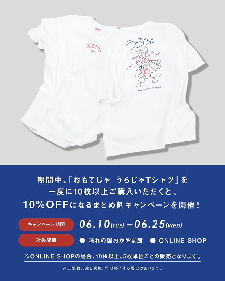 期間中、『おもてじゃ うらじゃTシャツ』を一度に10枚以上ご購入いただくと、10%OFFになるまとめ割キャンペーンを開催!