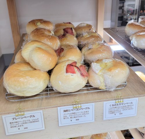 棚には、ベーグルを中心に、調理パンや菓子パン、食パンなど約20種類以上のパンが並んでいます。