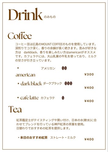 パンと一緒に紅茶やコーヒーを味わえます。コーヒー豆は広島にある自家焙煎コーヒー豆専門店「MOUNT COFFEE」のものを使用。深煎りでコクのある美味しさを味わえます。