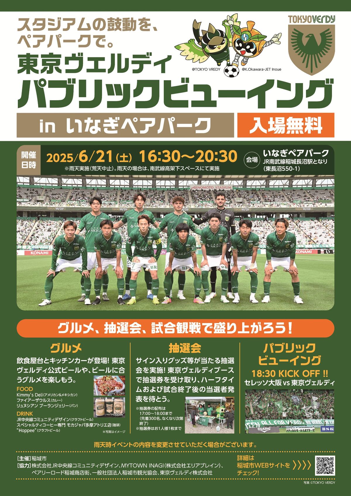 6月21日(土)アウェイ・セレッソ大阪戦当日、ホームタウンである稲城市、多摩市の2市で東京ヴェルディのアウェイゲームのパブリックビューイングを開催することが決定しました! 当日は各会場で、イベントも実施予定です。