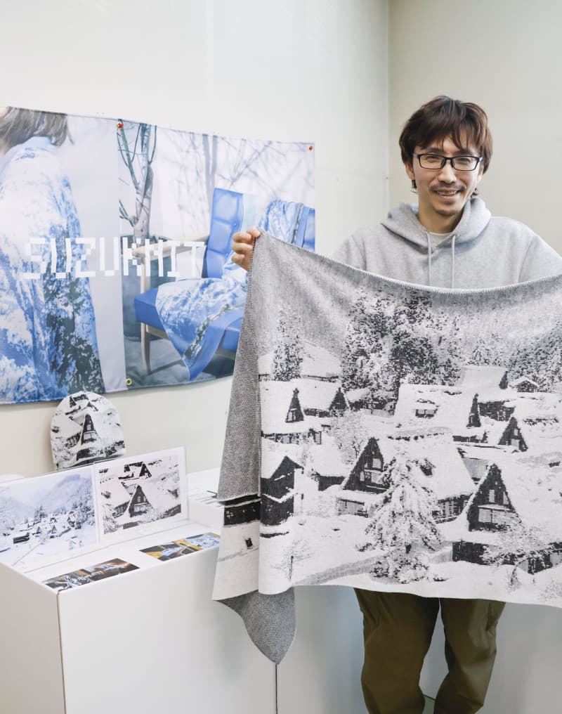富山県内の絶景を再現したブランケットを紹介するスズニットの長沢吉将さん富山県内の絶景を再現したブランケットを紹介するスズニットの長沢吉将さん