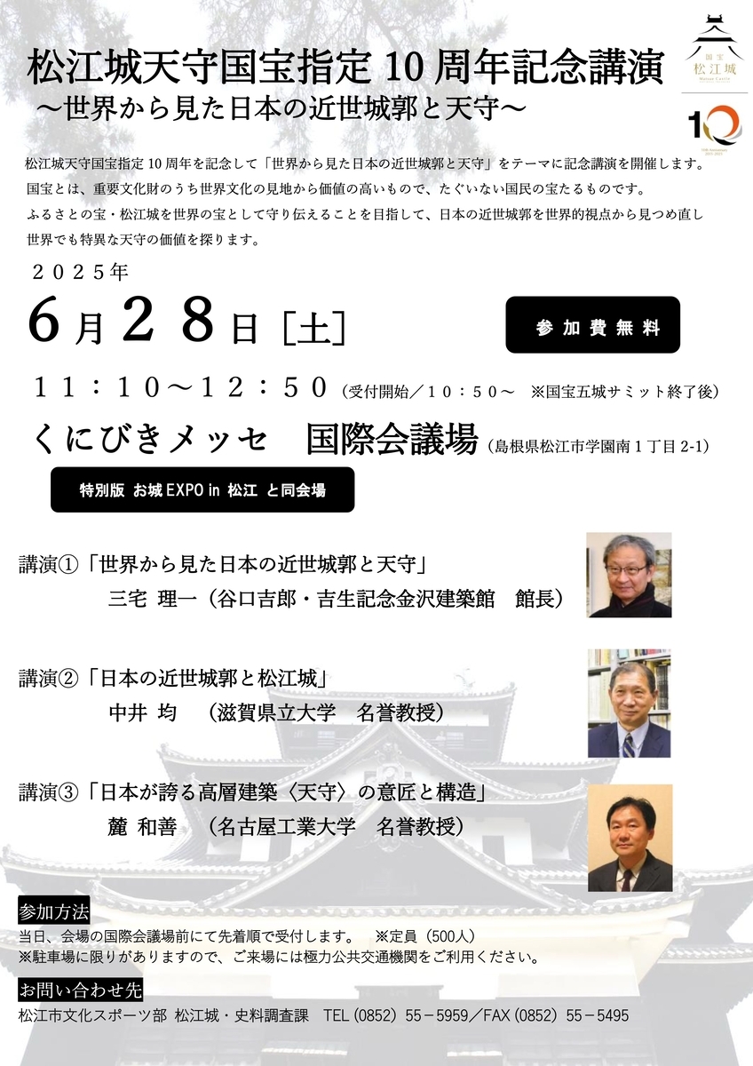 6月28日(土)、くにびきメッセ(島根県松江市)において松江城天守国宝指定10周年記念講演「世界から見た日本の近世城郭と天守」が開催されます。参加無料、事前申込不要。