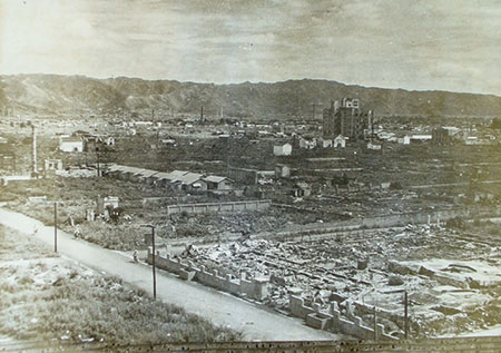 商工会議所屋上から北東方向を撮影した、焼け野原の和歌山。中央やや右寄りの建物は被災した丸正百貨店。(和歌山市立博物館所蔵)