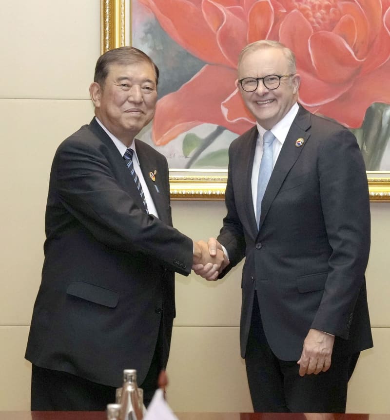 オーストラリアのアルバニージー首相(右)と握手する石破首相=2024年10月、ラオス・ビエンチャン(共同)