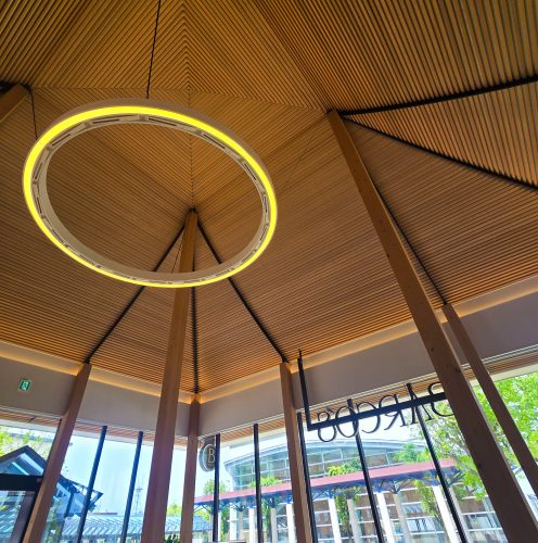 「集いの森店」の建物を象徴する集いリングには、多くの方に集ってもらえたら…という思いが込められています。