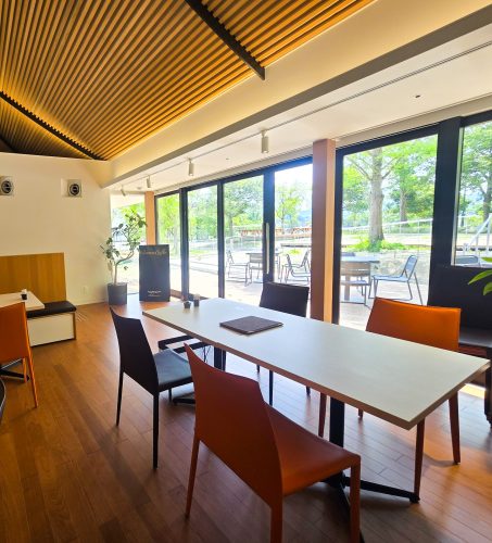 窓の向こうに広がる青い空と新緑の木々の鮮やかな色に魅了され、自然の美しさを心ゆくまで堪能できます。