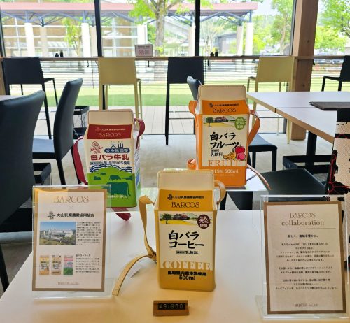 大山乳業農業協同組合とのコラボ商品は、以前人気だった「白バラ牛乳」と「白バラコーヒー」をモチーフにした2種類のバッグを再販。今回は新たに「白バラフルーツ」も加わりました。