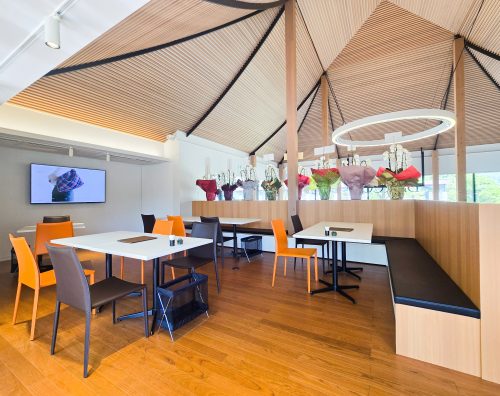 2階のテーブル席は、オレンジと黒の椅子が並ぶスタイリッシュな中に、温かさを感じるスペースとなっています。