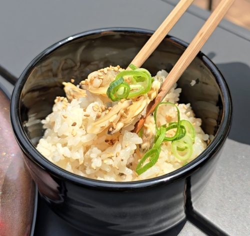 この日のご飯は、あさりの身が入った旨味たっぷりの炊き込みご飯でした。※ほぼ週替わりで具材を変えて提供。