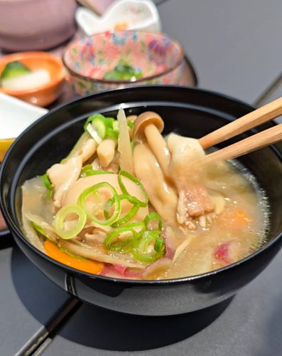 具だくさんのお味噌汁もおいしい。大根、人参、牛蒡、里芋、さつま芋、こんにゃく、しめじ、舞茸、豚肉とたっぷり入っているので満足感があります。※味噌汁の具材は日替わりです。