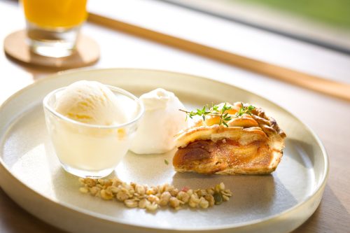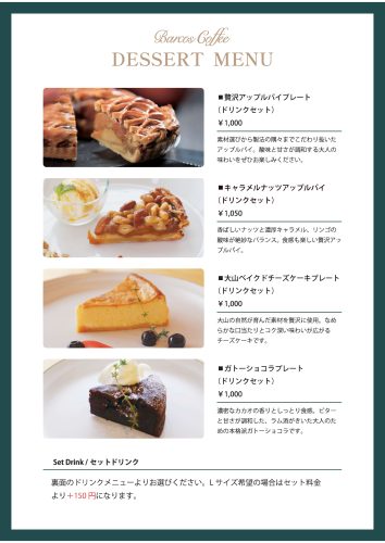 その他、カフェタイムでは (13:30以降からオーダー可能)、バルコスの人気メニュー贅沢アップルパイや、キャラメルナッツアップルパイ、大山ベイクドチーズケーキなどのスイーツがドリンクとセットで楽しめるプレートメニューもあります。