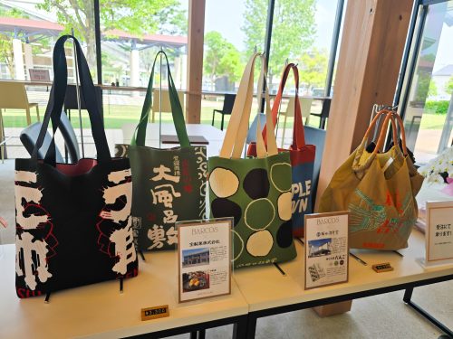 その他、大風呂敷が代表商品の「宝製菓株式会社」、倉吉市のショッピングセンター「パープルタウン」、打吹公園だんごが人気の「石谷精華堂」、倉吉市の「元帥酒造」とのコラボ商品も!見ているだけで心が和む地元愛に満ちたバッグです。地域振興に向けた取り組みの一環となっています。