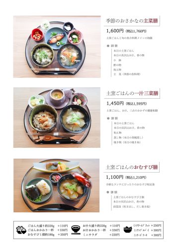 「季節の土窯ごはん和膳」をはじめ、「季節のおさかなの主菜膳」「土窯ごはんの一汁三菜膳」「土窯ごはんのおむすび膳」の4種類のメニューがあります。
